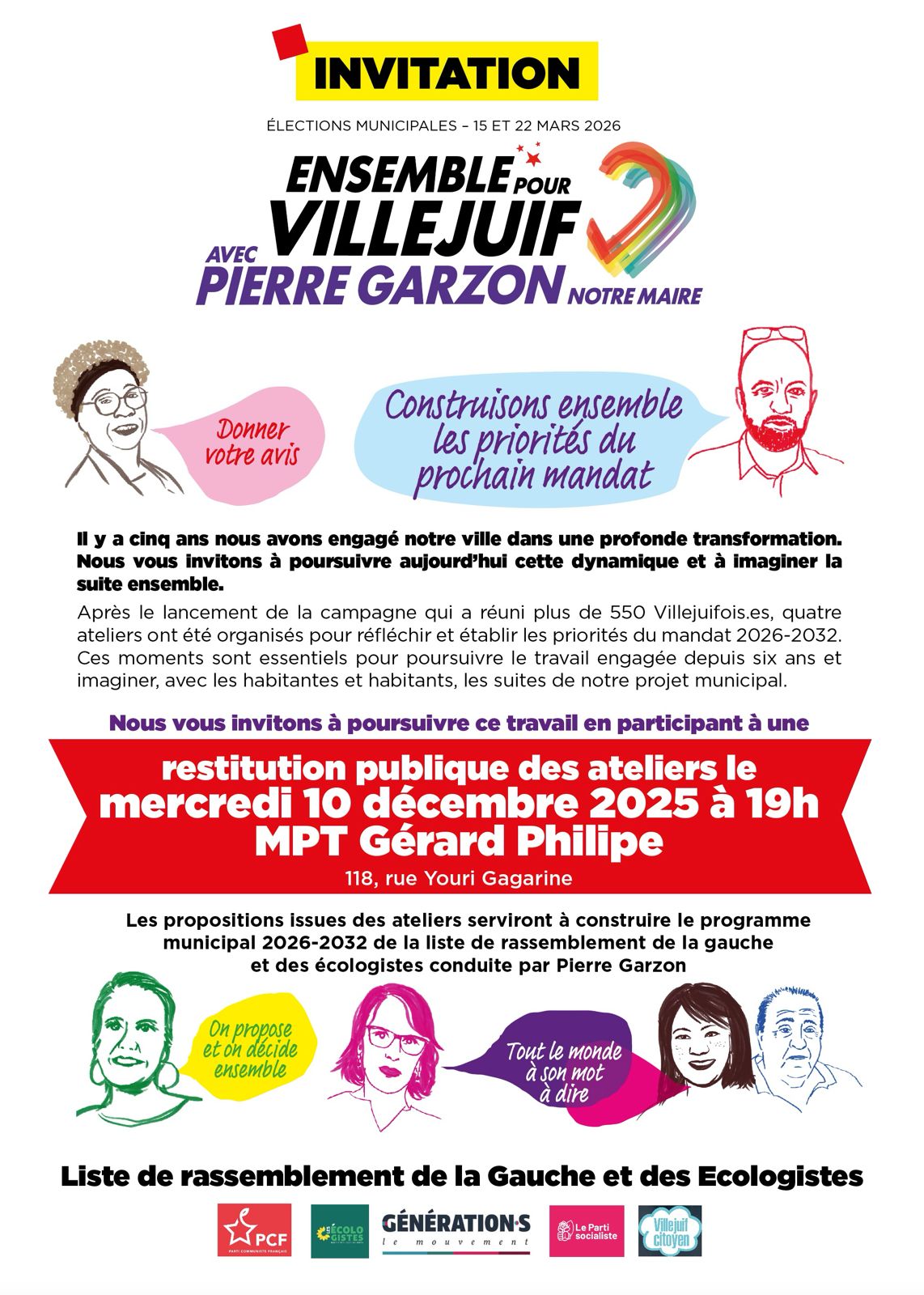 La troisième étape, ce sera dans moins de 15 jours, le mercredi 10 décembre à 19 h à la Maison pour tous Gérard Philipe, pour la restitution de toutes les propositions. Ce sera une étape importante dans l’élaboration du programme municipal 2026-2032 de la, liste de rassemblement de la gauche et des écologistes conduite par Pierre Garzon